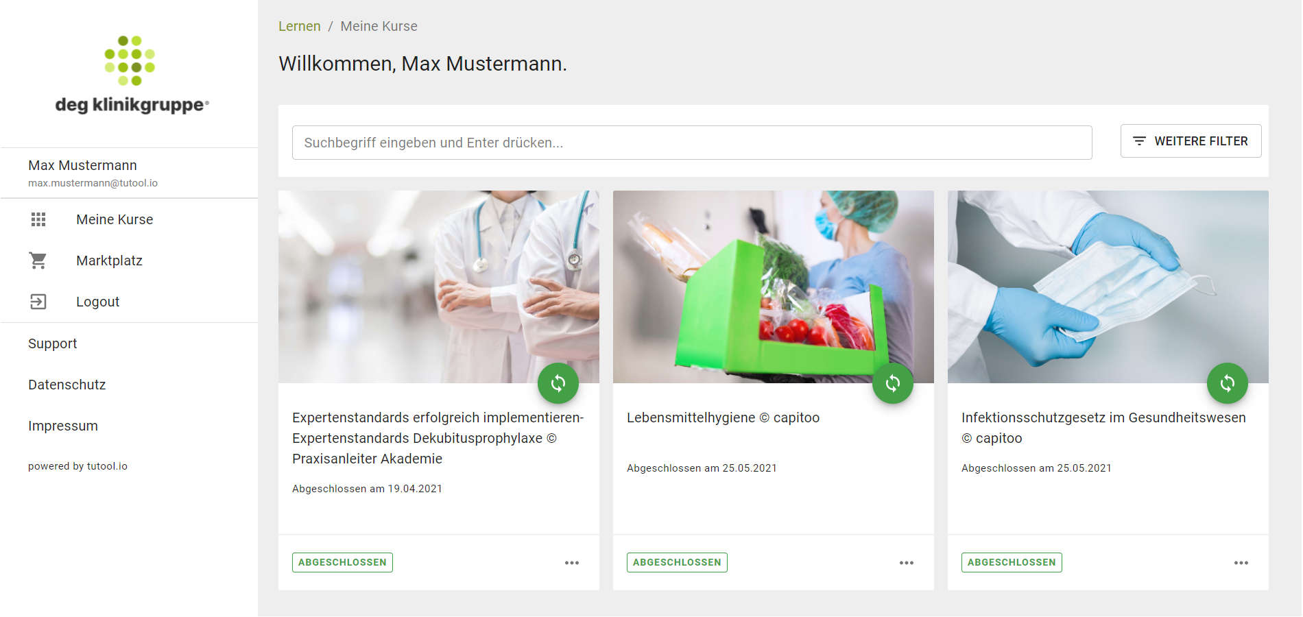 Kurse können auch nach dem Abschluss aufgerufen werden. Im Status „Abgeschlossen“ wird anstelle des Play-Buttons ein Replay-Button angezeigt. Aufrufe über den Replay-Button werden nicht dokumentiert.