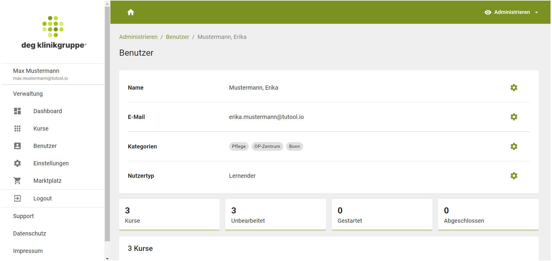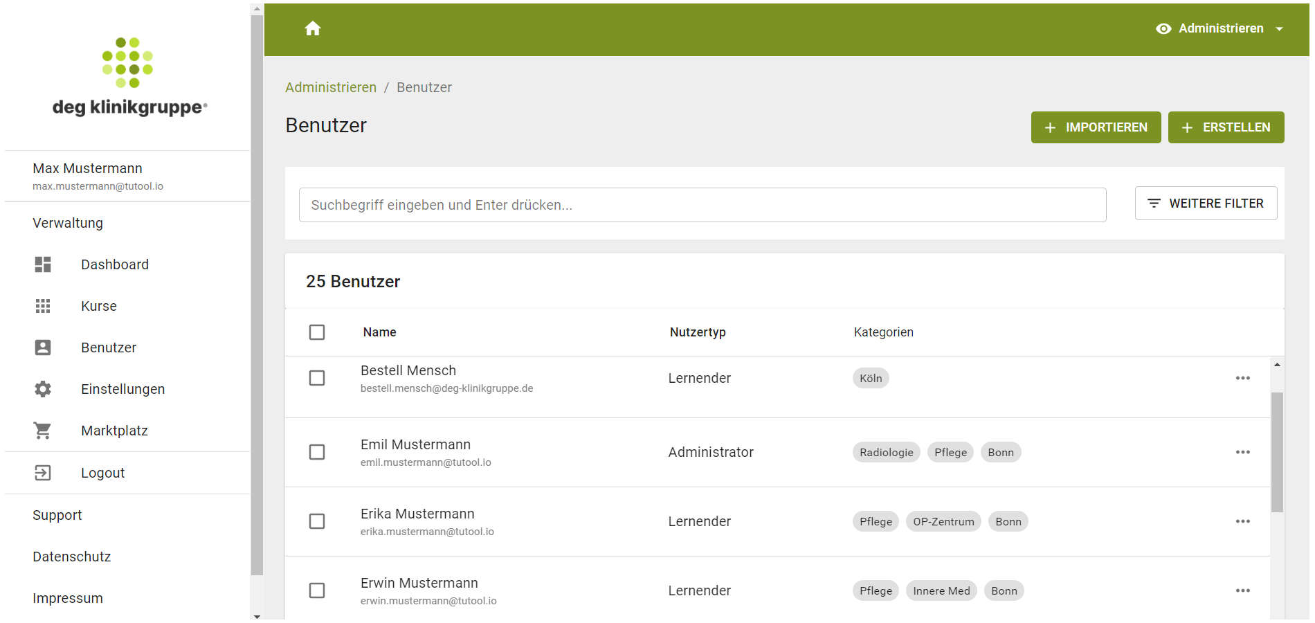Benutzerkategorien können frei definiert und den Benutzern zugeordnet werden (z. B. Standort, Abteilung, Dienstart), um beispielsweise Kurse gezielt zu distribuieren und spezifische Berichte/Statistiken zu konfigurieren.